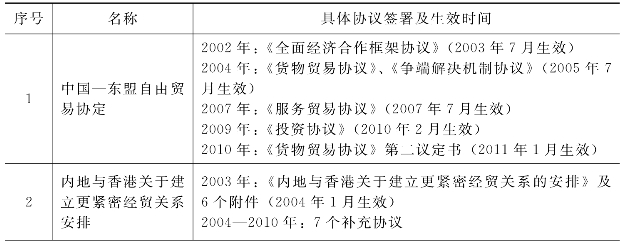 表7-19 截至2010年年底我国签订的自由贸易协定进展