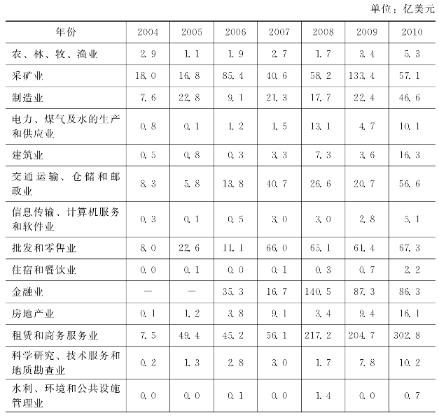 从对外直接投资的行业分布来看,租赁和商务服务业逐步取代采矿业,成为中国对外直接投资第一大行业。2004年,采矿业对外直接投资18.0亿美元,占中国对外直接投资总量的32.7%,租赁和商务服务业对外直接投资仅7.5亿美元,占中国对外直接投资总量的13.6%;到2010年,采矿业对外直接投资57.1亿美元,占中国对外直接投资总量的比重下降至8.3%,而租赁和商务服务业对外直接投资高达302.8亿美元,占中国对外直接投资总量的比重上升至44.0%,增长30.4个百分点。