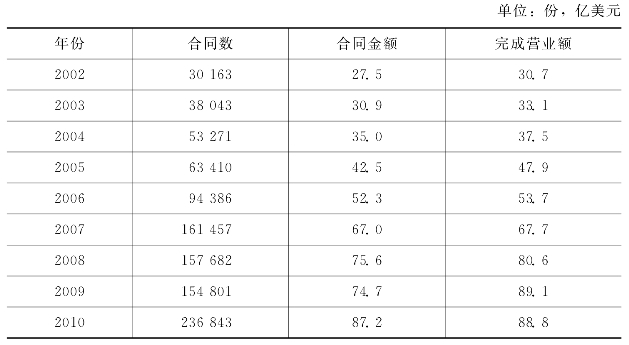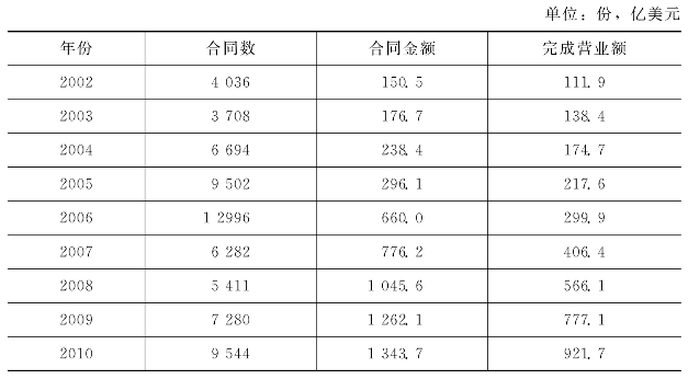 2002—2010年,中国对外承包工程合同数从4 036份增长到了9 544份,最高年份达12 996份,年均增速为5.6%;合同金额从150.5亿美元增长到了1 343.7亿美元,年均增速29.6%;完成营业额从111.9亿美元增长到了921.7亿美元,年均增速29.7%。(见表7-26)