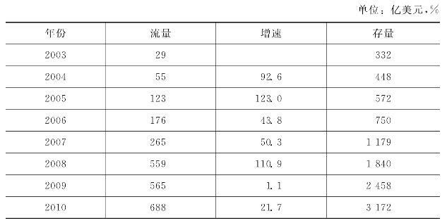 加入世贸组织后,中国对外直接投资呈现快速增长之势。2003—2010年,中国对外直接投资流量从29亿美元增长到了688亿美元,年均增速高达57.6%;中国对外直接投资存量从332亿美元增长到了3 172亿美元,年均增速高达38.0%。值得注意的是,以跨国并购方式进行的对外直接投资迅速发展。2010年,以并购方式实现的对外直接投资238亿美元,占对外投资总额的40.3%。(见表7-24)