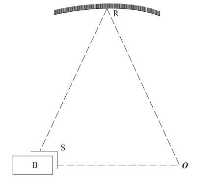 如图所示,想象小盒子B里面装了很多与处于热扰动[59]时的粒子完全一样的粒子,并且盒子上开有两个由盖子S关着的小孔。盖子S能够自动打开和关闭。盒子里的粒子的数目的选定方式决定了会出现以下情况:当盖子打开时,有一个粒子通过小孔离开盒子,然后沿着直线SO跑到观察者位于的O处,并且第二个粒子在发射体R上经历了弹性反射,然后沿着路径SRO也跑到O处。