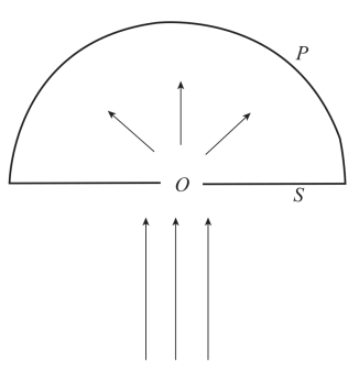 如上图所示,设S是一个遮光屏,在它上面开一个小孔O,P是一个半径很大的半球面形的照相胶片。假定电子沿着箭头所示方向落在S上,这些电子有一部分会穿过小孔O。由于电子具有速度,并且孔很小,因而这些电子会均匀地分布在所有的方向上,从而作用在胶片上。而关于量子论的这两种观点都把这个过程看成是一个德布罗意波[51]的衍射过程,因为它几乎垂直射到屏上,并且在小孔处发生了衍射。而在小孔的另一面产生了球面波,并且这些球面波还传播到胶片上。同时,它们在P面上的强度决定了到达胶片上的波的量度。