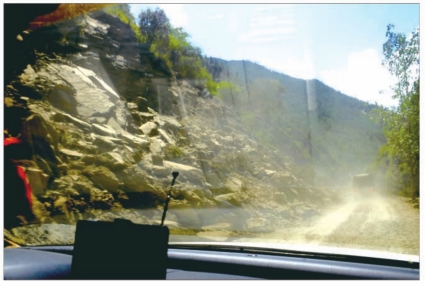 就在这时,遇到了第一次山体塌方。突觉前方乱石穿空,尘土弥漫遮住去路,耳边全是“嘭嘭”的石头滚落的声音。一时间仿佛置身枪林弹雨,心里惊叫起来,啊,我还活着吗?之后一切静止没了声响,停顿片刻……猛轰油门,心惊胆颤地往前冲,不敢向上看山体侧面,因为那些大块大块的石头,仿佛随时都要掉下来……我们终于安然无恙地冲出塌方区,顺利通过之后,我发现自己紧张得手心里都是冷汗,这个经历简直太刺激了太具挑战性了。
