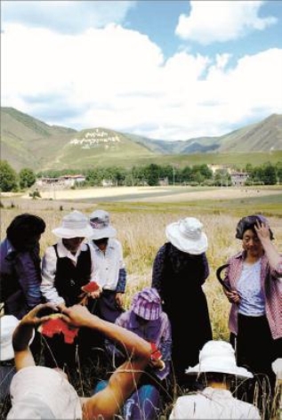 今天折回318国道,继续西行。途中遇到一群割青稞的藏人,我们招呼他们一起来吃西瓜,这一刻充满分享的喜悦感。