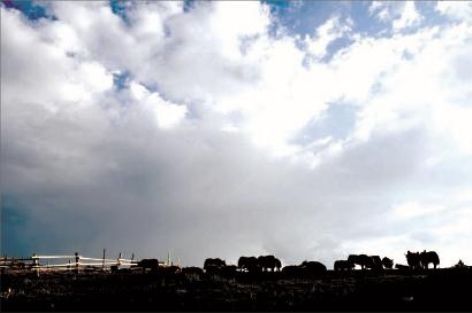 这是一张扩展了的黄金分割法构图形式,将地平线压到整幅画面的六分之一处,天空云彩占画面六分之五,充分展示了高原牧场特有的美景。以天空测光曝光,使天空与牛群形成鲜明的明暗对比。在侧光的照射下,木栏一角显得格外耀眼,与牛群也形成了明暗对比,整个画面反差强烈、层次感强。用光圈11,快门1/160秒,焦距32mm拍摄。