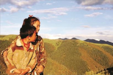 这也是在游动牧场拍的一张照片。突然间,天空云层大开,西下的太阳照射出黄灿灿的光线,当我转过身来,远眺那美丽的天空和山峦时,突然发现牧场里的姐弟俩紧紧依偎着站在牧场的山梁上,注视着前方,淳朴,自然。我迅速举起相机,将主体放在画面左侧黄金分割线上,以背景天空测光曝光(这样可以使人物的脸部更红一点),按下快门。用光圈11,快门1/ 100秒,焦距70mm拍摄。