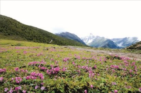 白马雪山位于德钦县内,素白的雪山和高大的冷山相映成趣,高山杜鹃在草甸间自由地生长,一丛丛、一簇簇,璀璨烂漫。
