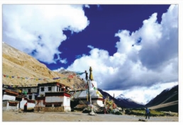 前方,即将到达离珠峰最近的一个寺庙——绒布寺。绒布寺全称“拉堆查绒布冬阿曲林”寺,海拔5800米,是一个富有地方特色的僧尼混居寺庙,也是世界上海拔最高的寺庙。很多登山专家认为绒布寺所在地正是观看珠峰的最佳位置。