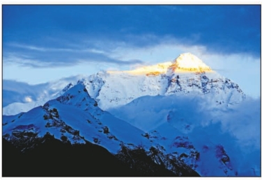 大概晚上8点半,奇景终于到来,夕阳的余晖洒在珠峰峰顶,放射出黄灿灿的光辉,太美了,真是工夫不负有心人。我真想狂奔回去大声呼喊大家都来观赏、拍摄,但我已经非常疲倦,再加上缺氧,没力气回去叫他们了,只好独自欣赏并拍摄这一大自然的绝伦景观。