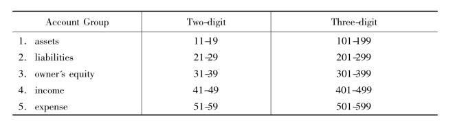 For example,cash may be numbered as 11 under the first account code system and 101 under the second system.The cash account may be further divided as 101 cash-first national bank;cash-second national bank,and so on.