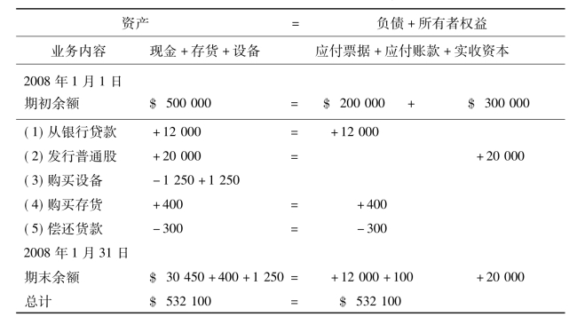假定GRF公司于2008年1月1日成立,成立时拥有资产500 000美元,负债200 000美元,所有者权益(实收资本)300 000美元。会计等式为: