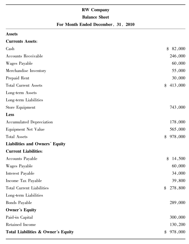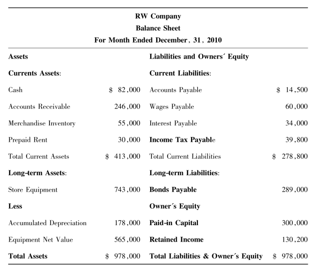 The balance sheet may be arranged in either account form or report from.In the account form,the assets are listed on the left side of the page and liabilities and owners equity on the right side.Table 10-2 shows a balance sheet of RW Company in account format.In the report form the assets are listed at the top;the liabilities and owner's equity are listed below the assets.Table 10-3 shows a balance sheet of RW Company in report format.