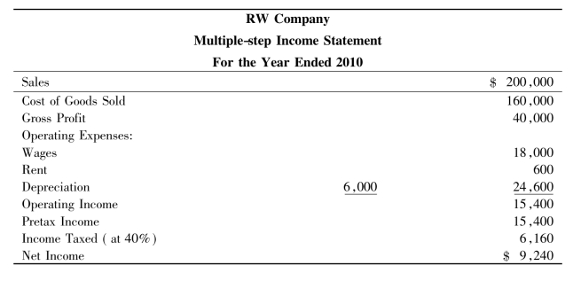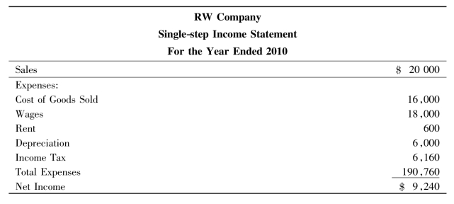 There are two common forms of income statements:the Multiple-step Income Statement contains the series of steps in which costs and expenses are deduced from revenue.As a first step,the cost of goods sold is deduced from sales to produce an amount for gross profit.As a second step,operating expenses are subtracted from the gross profit to obtain operating income(or operating profit).As a final step,income tax expenses are subtracted to determine net income.The multiple-step income statement is shown in Table 10-4.The Single-step Statement is another format of income statement which groups all revenues together and then lists and reduces all expenses together without drawing any intermediate subtotals.The Single-step Statement is show in Table 10-5.