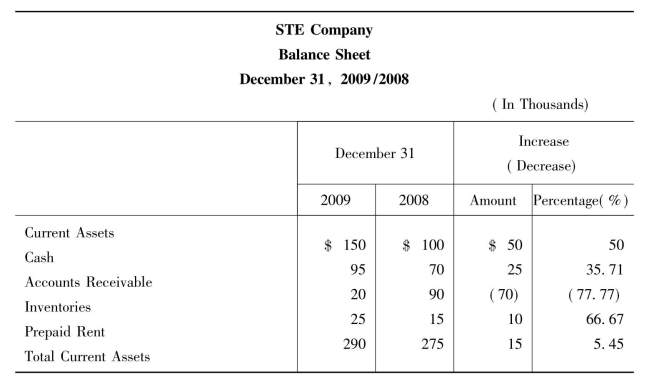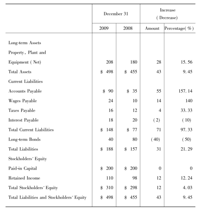 The STE Company's balance sheet in Table 11-1 shows that the total assets and total liabilities and total stockholders'equity have risen during the past year by $43,000 or 9.45%.The increase in assets is caused mainly by long-term assets,the current assets also have increased.The total increase in liabilities and stockholders'equity is caused by the most items of current liabilities.