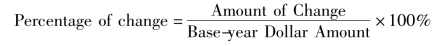 To see how trends develop over time,analysts often look at several years'worth of a company's financial information such as the last five years,ten years and even more longer.To compute the trend changes,we must select the base year,whose amounts are set equal to the base-year amount or to 100 percent.The formula of computing the dollar amounts change and the percentage change is shown as follows: