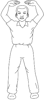 ③ 两手上举过头,同时翻掌,掌心朝上,指端相距约1寸,四指并拢,拇指外分,微触或对着天门(前囟门)处,两虎口相对成四边形。
