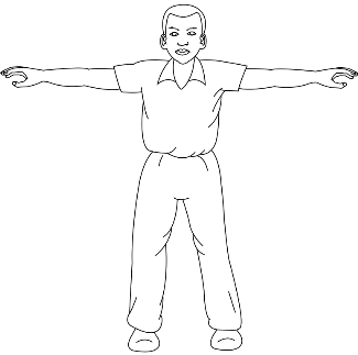① 左脚向左横跨一步,与肩同宽,两膝微屈,足趾抓地。两臂同时外展至水平位,掌心向下。肘、腕自然伸直。