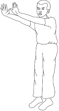 ② 两手翻掌上提至胸,拇指桡侧着力,徐徐向前推出,高与肩平。