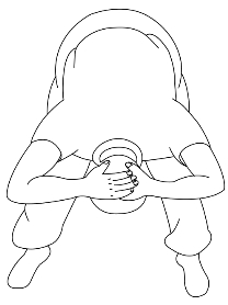 ③两掌翻转,掌心朝下,慢慢下压,五指自然分开,虎口朝内如握物状,悬于膝上或虚掌置于膝盖,上身稍向前俯。