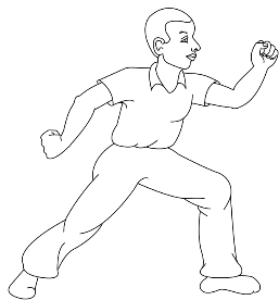 ④身体向右转侧,成右弓步,面向右方。两上肢同时动作,右上肢外旋,屈肘成半圆状,手握空拳用力,拳心对面,高不过肩,双目注拳,拳高约与肩平。肘不过膝,膝不过足尖。左上肢内旋向后伸,作螺旋劲,上身正直,塌腰收臀,鼻息调匀。