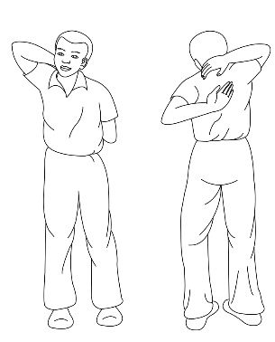 ②屈肘,十指交叉相握,掌心抱持后脑。勿挺腹凸臀。