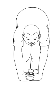 ④直膝弯腰俯身,两手用力使头尽向胯下,两膝不得屈曲,足跟勿离地(图2-18)。同时鸣天鼓左右各24次。