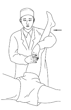 法或掌根按揉法,3~5分钟;配合风市、阳陵泉、昆仑、解溪诸穴的指揉法,而后做被动直腿抬高运动(图15-4)1~3次,视患者承受度而定。最后以拿股后,拿委中、承山,搓下肢,抖下肢结束治疗。