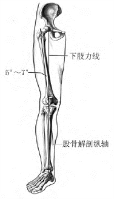 正常情况下,下肢的力线一般是由股骨头中点至踝关节中点,此线经过膝关节中心或稍偏内侧。下肢力线与身体重力线呈3°的外翻角,股骨解剖轴线与下肢力线呈5°~7°的外翻角(图1-10)。