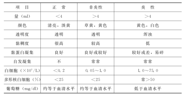 一般认为,原发性骨关节炎的滑液是“非炎症性”的。然而,关节液的增多、常见的黏滞性降低、轻微但明显的细胞异常增多和滑液蛋白的中度升高,表明有轻微的炎症性滑膜炎。