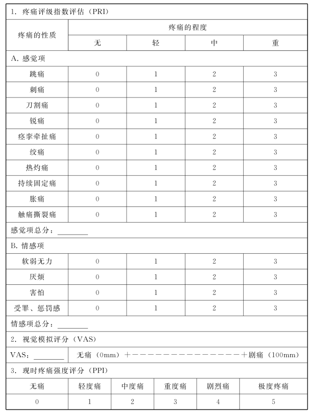 1987年Melzack在McGill疼痛原表的基础上提出一种简化的疼痛问卷,并将视觉模拟方法加入其中,成为一种简便实用的综合问卷,称为简式的McGill疼痛问卷表(Short-from of McGill pain questionnaire,SFMPQ)(表6-1)。