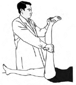 患者取仰卧位,患肢内收抬高。医者立于健侧,一手托扶患肢跟腱部,一手扶按于膝关节前方。医者两手伸直,做相反方向的推拉交错用力,将患肢徐徐抬高到极限(图14-11)。双下肢交替,扳一次即可。切忌粗暴用力,造成软组织损伤。