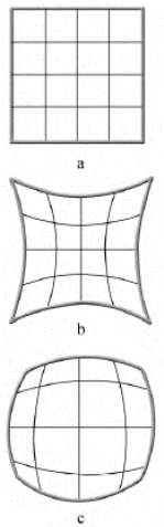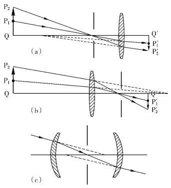 畸变同样是由于光束的倾斜度较大引起的。与球差、彗差和像散不同,畸变并不破坏光束的同心性,从而不影响像的清晰度。畸变表现在像平面内图形的各部分与原物不成比例。图1-10a是放在物平面内的方格,若远光轴区域的放大率比光轴附近大,在像平面内就会出现如图1-10b所示的情景,这现象称为枕形畸变。反之,若远光轴区域的放大率比光轴附近小,在像平面内就会出现如图1-10c所示的情景,这现象称为桶形畸变。究竟产生哪种畸变,与孔径光阑的位置有关。例如,对凸球镜片(凸透镜)来说,将光阑放在前面,如图1-11a所示,就会产生桶形畸变,光阑放在后面,如图1-11b所示,则产生枕形畸变。有的照相机里采用如图1-11c所示的对称镜头,将光阑放在一对相同的透镜中间,可以使两种相反的畸变互相抵消。