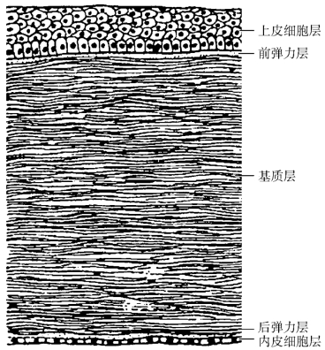 角膜与巩膜共同组成了眼球壁的外层,前1/6为透明的角膜,后5/6为瓷白色的巩膜。在组织学上角膜分5层:上皮层、前弹力层、基质层、后弹力层及内皮层(图2-2)。