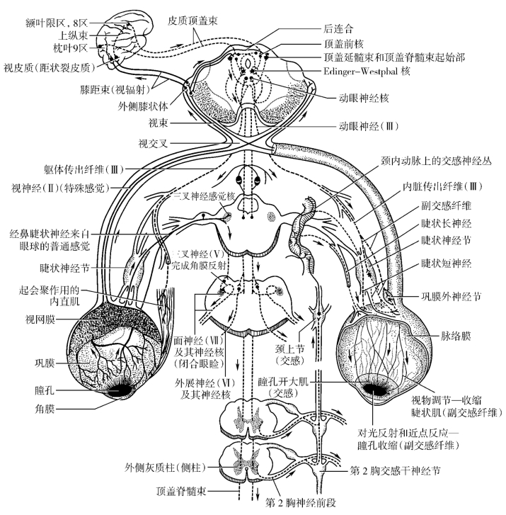 1.瞳孔的反射及其通路 瞳孔传入纤维伴视觉纤维同行,通过视神经、视交叉和视束,在接近外侧膝状体时离开视束,经四叠体上丘臂进入中脑顶盖前区,然后到达顶盖前核。在顶盖前核内更换神经元,再由此核发出纤维,一部分绕中脑导水管,与同侧E-W核相联系;另一部分则经后联合交叉到对侧,与对侧E-W核相联系。一般认为瞳孔的光反射传入纤维纤细,且不含髓鞘。光反射的传出途径是经两侧E-W核发出的纤维,加入两侧第Ⅲ脑神经,至眶内的睫状神经节,在节内交换神经元后,经睫状短神经入眼,终止于瞳孔括约肌。