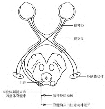 3.视体反射 当阅读时双眼无意识的扫视运动,头和颈朝向视刺激的方向,保护性闭眼,甚至为了防护举起手臂的反射动作都属视体反射。其反射途径是视觉冲动沿着视神经、视交叉及视束到达上丘,在上丘冲动被传输到顶盖延髓和顶盖脊髓束到达脑神经运动核和脊髓前灰白柱神经元(图5-3)。