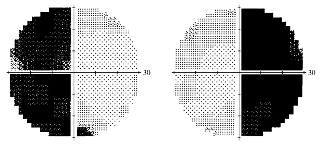 图6-6 继发于囊性垂体腺瘤的双颞侧偏盲(前右后左)