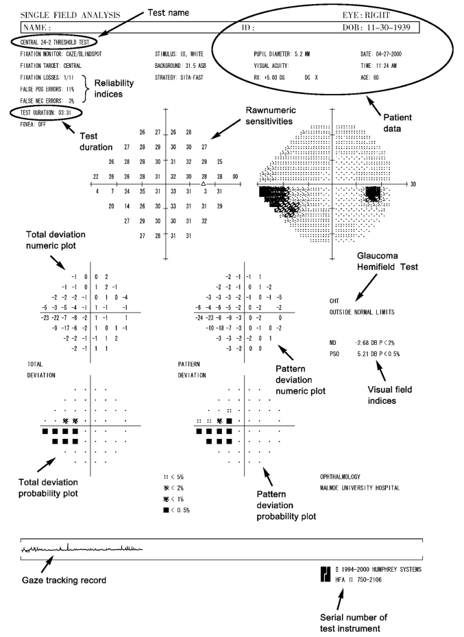 阈值数据:24-2有54个测试点,30-2有76个测试点,图内记录每个测试点的阈值,括弧内的为重复测试的值。阈值dB愈高表示该处感光细胞及其轴索的灵敏度愈高。中央4个测试点代表离注视点15°的区域,灵敏度最高,此处阈值低至0,则中心视力会受威胁甚或严重下降。要注意阈值数据中阈值=0(或极低)的区域,它的意义不能由形态偏差来说明。