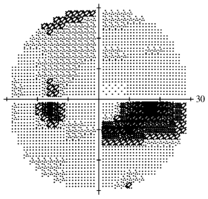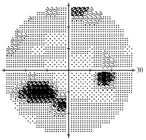 如果视野缺损类型能确定,并与其他临床发现(眼底征象)明显相关,那么就增强了诊断的可信度。例如:明确的鼻侧阶梯或弓形暗点缺损与视盘和神经纤维层改变一致;明确的偏盲视野;视野丢失与眼底观察一致;视野丢失与病史一致。如果不能确定,也不能被其他检查所支持,则需要重复检测或进一步的评价。