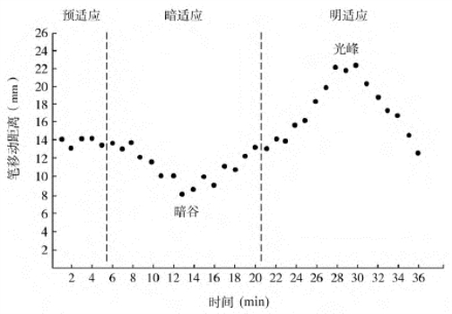 (2)暗谷时(DTT):暗适应开始到暗谷电位出现的时间。正常值6~12min,大于12min为异常。