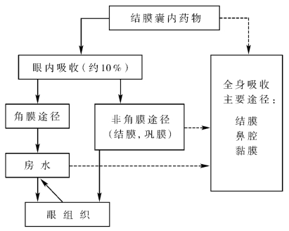 1.局部给药 大多眼视光系统病的有效药物治疗是局部给药。药物由表面进入眼球内组织,大部分须先从泪膜转运入角膜。而角膜上皮质的细胞之间,均有紧密连接,药物不能经细胞外间隙进入,只能由细胞膜转运,同时具有脂溶性和水溶性的药物易透过角膜。另外药物的浓度、溶解度、黏滞性等也影响角膜的通透性。药物也可以从眼表结构中的血管,如角膜缘血管和结膜血管吸收进入眼内。药物到达眼内后主要通过房水弥散,分布到眼前段各组织作用部位,少量可经玻璃体弥散到视网膜表面。完整的晶体和悬韧带及玻璃体膜均有屏障作用,阻止药物进入其内,也阻止药物流出其外(图10-1)。