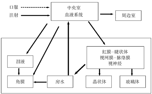 2.全身给药 眼视光系统的全身给药主要为口服、肌内注射和静脉注射。因为眼视光系统主要为眼球与视路,存在血眼屏障,包括血房水屏障、血视网膜屏障、血脑屏障特殊组织解剖结构,前者解剖结构包括睫状体毛细血管内皮细胞,睫状体色素上皮细胞,睫状体无色素上皮细胞,后者包括视网膜毛细血管内皮细胞,视网膜感觉层,脑膜等。因此全身给药难以通过这些屏障,故多为辅助治疗。全身给药后药物进入眼内过程如下(图10-2)。