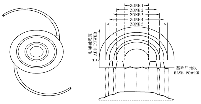 单焦人工晶体只有一个屈光度,人工晶体光学部分本身无调节能力,所以不能同时清晰地看远和看近物像。随着人工晶体的制作材料和加工工艺的不断改进和完善,近年来出现了多焦点人工晶体(MIOL)。此类人工晶体是应用折射和(或)衍射的光学原理(彩图31),使经过MIOL的光线产生多个焦点,远处和近处物体发出的光线均能聚焦于视网膜上。应用同时知觉原理,如果远处和近处光线通过MIOL聚焦于视网膜上的屈光力之差≥3D,二者在视网膜上产生的物像差别过大,大脑皮质不能将两个物像融合,而是选择与被注视物体更接近,更清晰的物像抑制另一个物像,所以MIOL能够为患眼提供良好的远近视力,因此在置入MIOL时,其理想屈光度亦应使术眼呈正视状态。