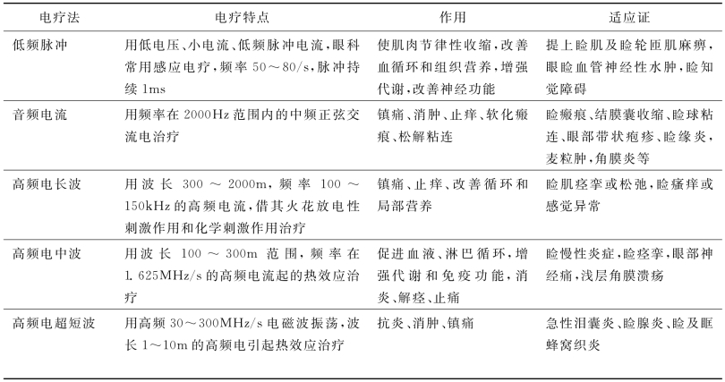 其他电疗法,如低频脉冲电疗法、音频电疗法、高频电疗法的作用和适应证见表14-2。