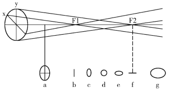 曲率不等的角膜与晶状体表面,存在有最强与最弱的互相直交的两条经线,即主径线。光线通过主径线,形成前后两条正交焦线。通过角膜垂直的强主径线X上的光线,聚焦于F1,形成水平焦线,称前焦线。光线通过水平的弱主经线Y,于F2形成垂直焦线,称后焦线。两焦线间的空间,称为Sturm间隙。间隙的距离长度,即表示散光的程度;两焦线距离愈大,则散光程度愈大。光线在此间隙内形成类锥体的形态,称Sturm光锥(图17-1)。
