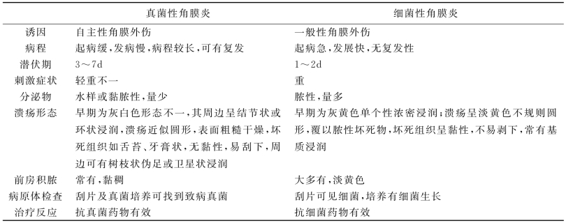 (1)诊断要点:①常有农业性外伤史,如稻谷弹伤角膜、植物枝叶擦伤角膜等。②发病缓慢,刺激症状较轻。病程较长;溃疡表面干燥易碎,如牙膏或豆腐渣样,易刮下;溃疡大而重,溃疡周围可出现浅层基质浸润,可有“伪足”或“卫星灶”。③前房常有积脓。④真菌涂片检查和真菌的反复培养,可见真菌菌丝或真菌菌落。当角膜刮片及角膜培养均为阴性时,可考虑做角膜活检以明确诊断。