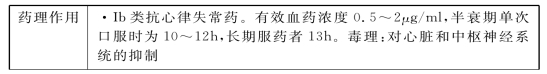 药效学:Ib类抗心律失常药,主要抑制钠离子的跨膜运动,缩短动作电位,相对延长有效不应期,降低心室肌兴奋性。治疗剂量不减慢正常心肌的传导速度,也不减低心肌收缩力和血压,甚至加快心肌传导纤维的传导速度,减轻单向传导阻滞,从而消除折返性室性心律失常。