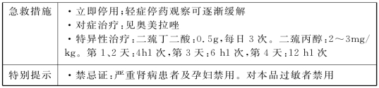 ●临床表现:口干、恶心、心悸、便秘等。有暂时性白细胞减少和轻度转氨酶升高。