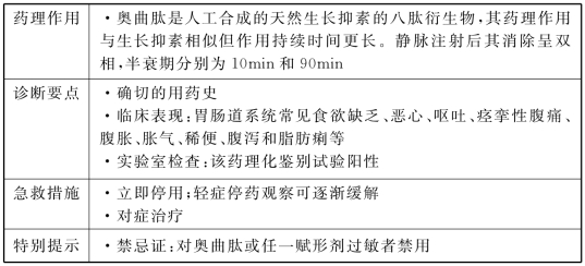 ●注意事项:①由于本品抑制胰岛素及胰高血糖素的分泌,在治疗初期会导致血糖水平短暂的下降。②胰岛素依赖型糖尿病患者使用本品后,每隔3~4h应测试1次血糖浓度,同时给药中,尽可能避免使用葡萄糖。必要的情况下使用胰岛素。③在连续给药的过程中,应不间断的输入,换药间隔最好不超过3min。有可能时,可通过输液泵给药。④老年患者和儿童使用本品的安全性资料尚未建立。