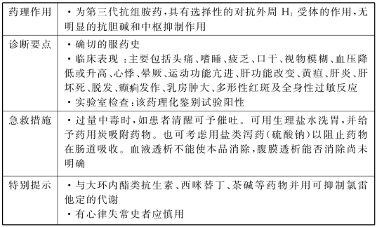 强力和长效的H1受体拮抗药,可选择性地阻断组胺H1受体而产生抗组胺作用,作用强而持久。但不易通过血-脑脊液屏障,不能与脑内H1受体结合,不具有中枢镇静作用,也无抗胆碱作用。口服吸收迅速,服药1h左右达血药浓度峰值。大部分在肝中代谢,代谢产物仍具有抗组胺活性。药物及其代谢产物的半衰期长达19d,故作用时间长。