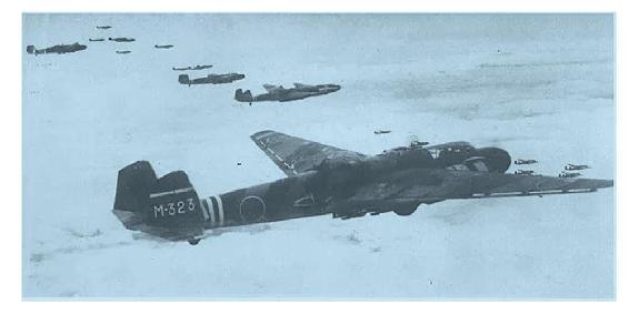 日本的鹿屋航空队18架“九六式”轰炸机,每架携带着2枚250公斤的炸弹,从台北的日本空军基地起飞,飞向中国大陆。
